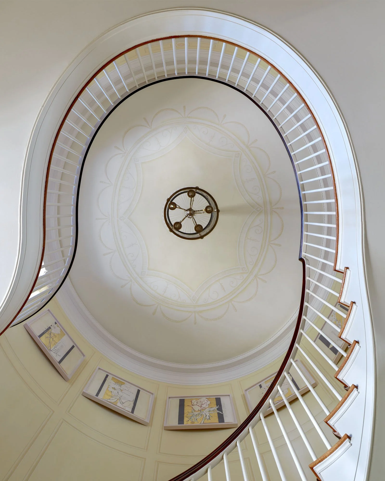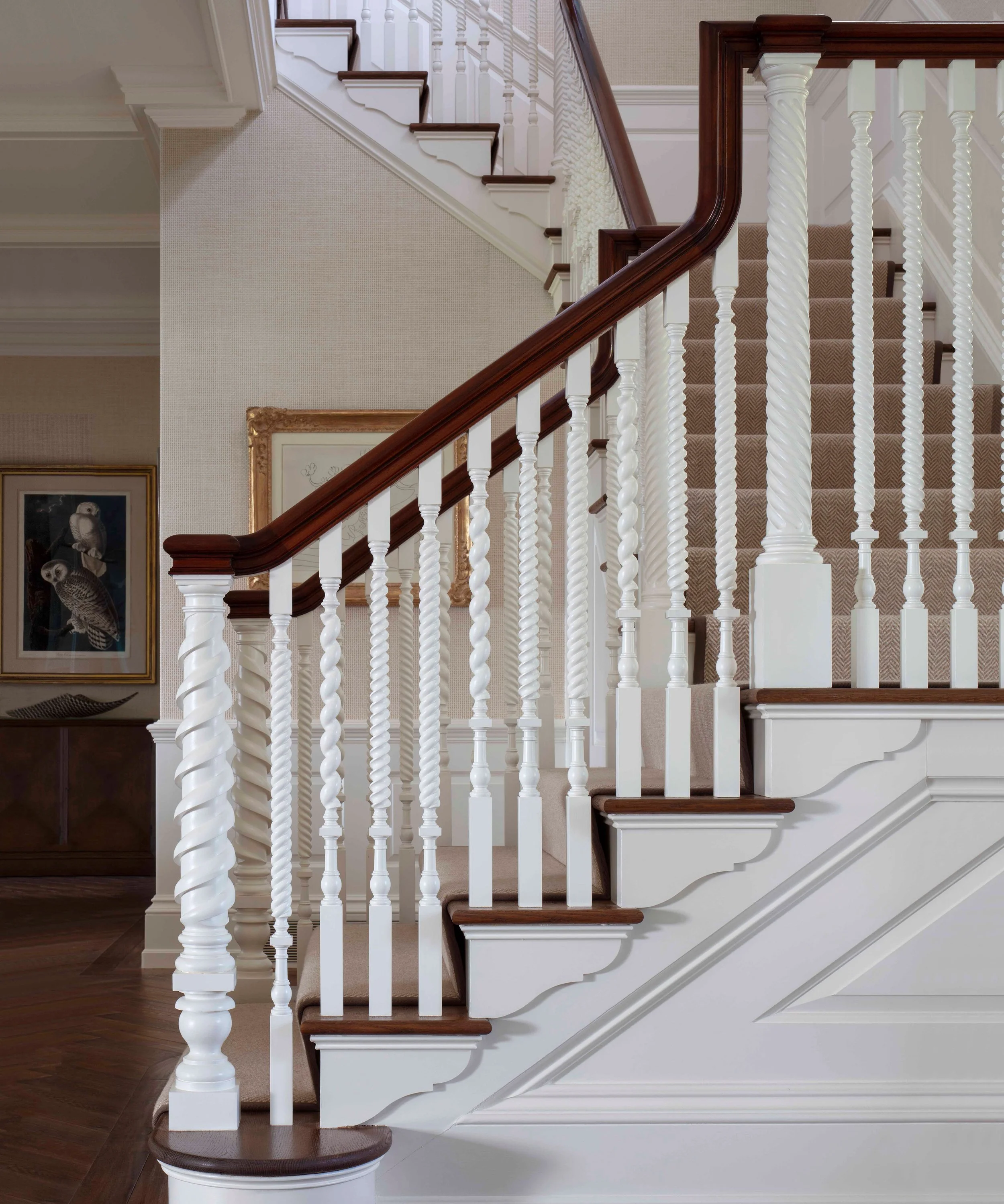 Three Charles Hilton Architects staircases: (left) This curved staircase features simple tapered balusters, which pair well with the complex decorative wallpaper. | (middle) More decorative balusters wrap this three-story staircase with newel posts in the corners. | (right) This staircase features highly decorative custom balusters and newel posts. The handrail is capped with a walnut handrail.