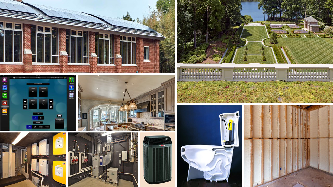 Examples of energy efficient features in a home: smart device control, LED lighting, green roofs, electrical co-generation systems, high efficiency HVAC, low-flow plumbing fixtures, and spray foam insulation.