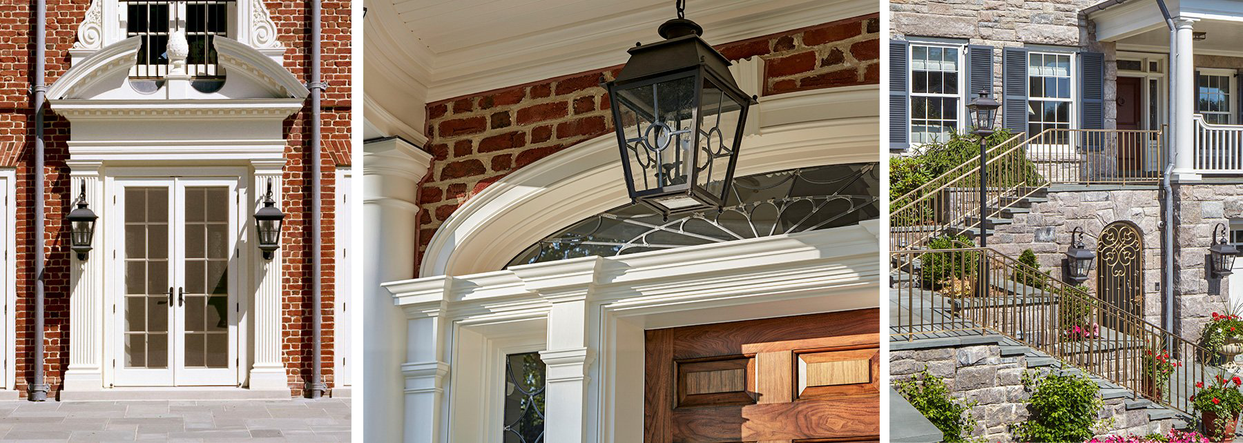 Three examples of colonial style homes with extensive millwork and trim.