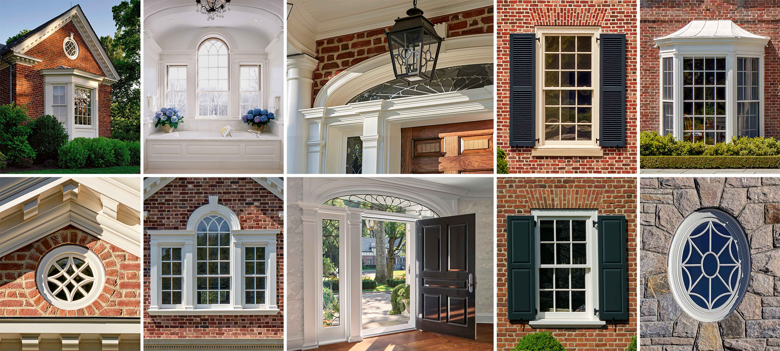 A collection of typical colonial style windows including: Double hungs, bay windows with fixed units, a Palladian window, a round window, a fanlight, and an oval window.