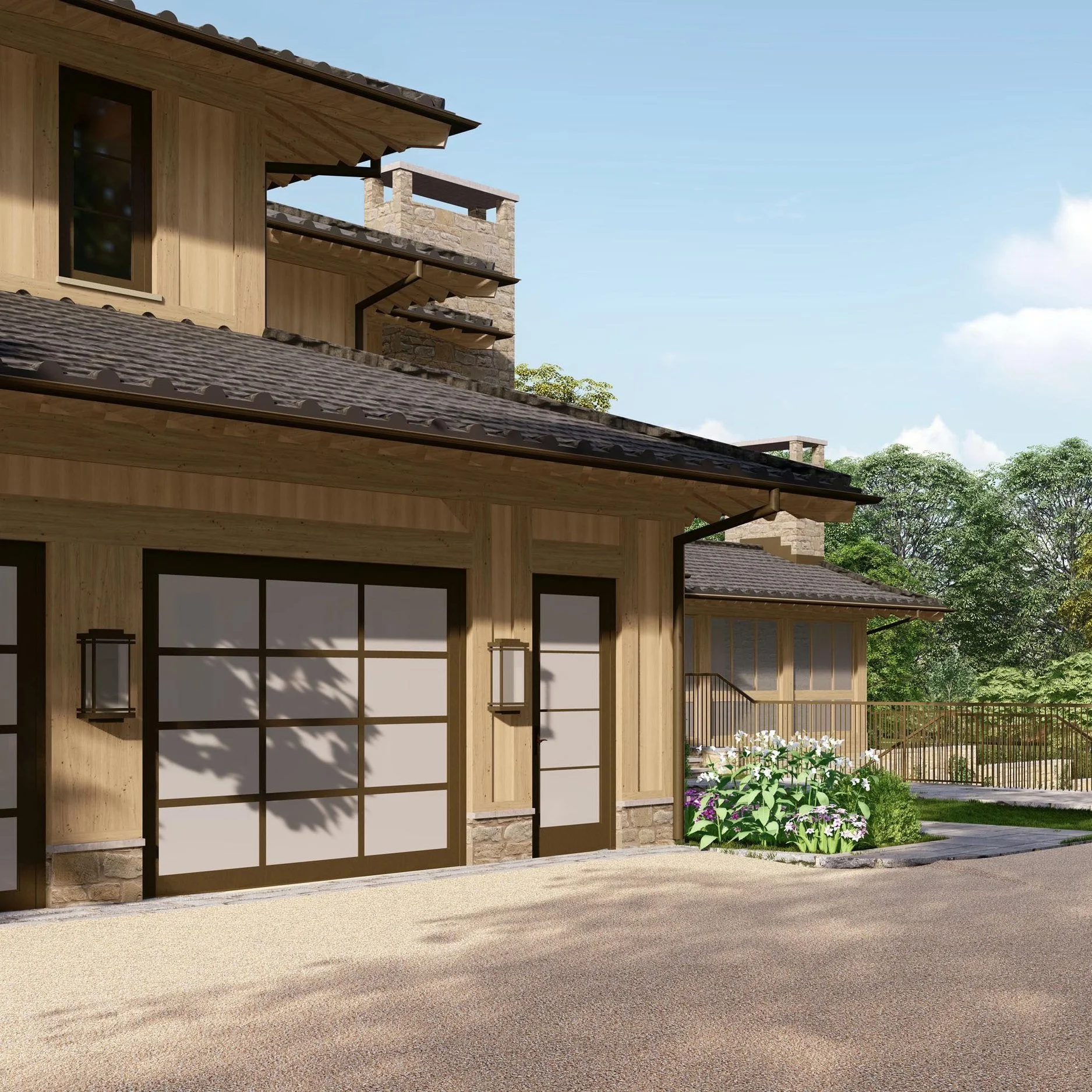 Exterior Experience – Designed to Live with the Landscape - A Serene ApproachThe home is approached via a gravel drive and arrival court, where the sound of crushed stone underfoot sets the tone for a retreat designed to slow the rhythm of daily life. Low, layered plantings frame the cedar façade, softening the geometry while maintaining clear visual access to the site’s prized gardens.